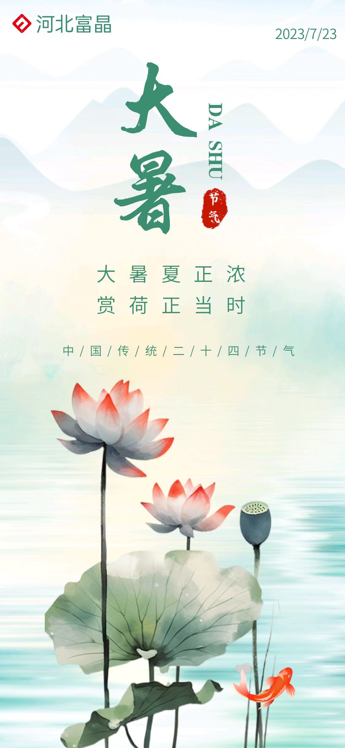 今天是7月23日星期日,也是大暑節(jié)氣,愿你迎夏而綻,自帶光芒,往后的日子里,眼中有美景,心中有清涼,快樂“暑”不盡,好運“暑”不完,河北富晶祝您清涼一夏,百事可樂!